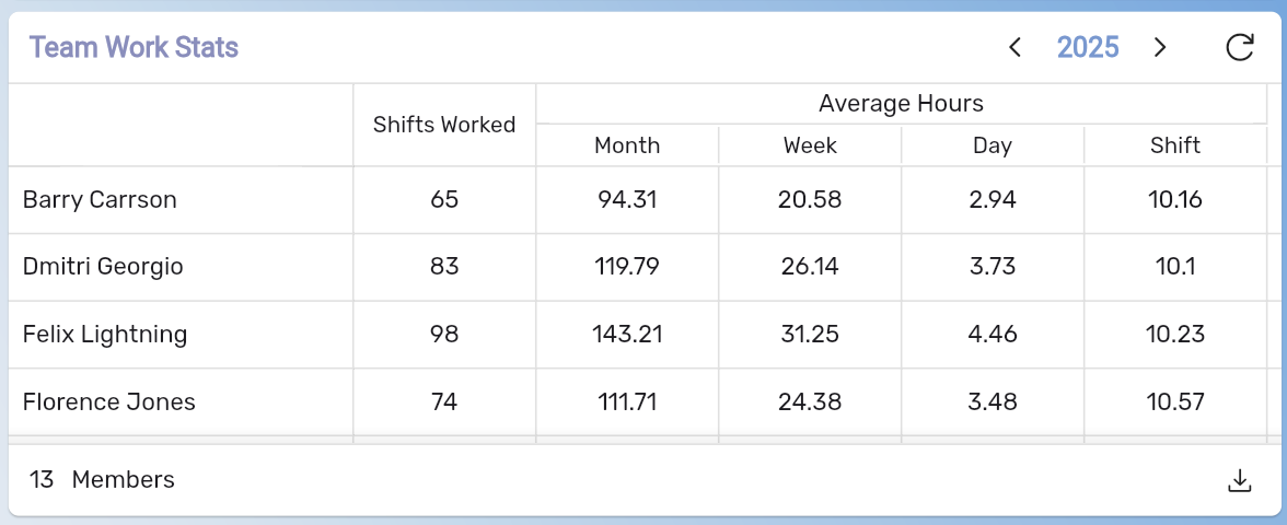 - Update: the Assigned By Shift Type widget has been improved. It now shows a row per person (rather than per day) and can show shift counts up to a year ahead.