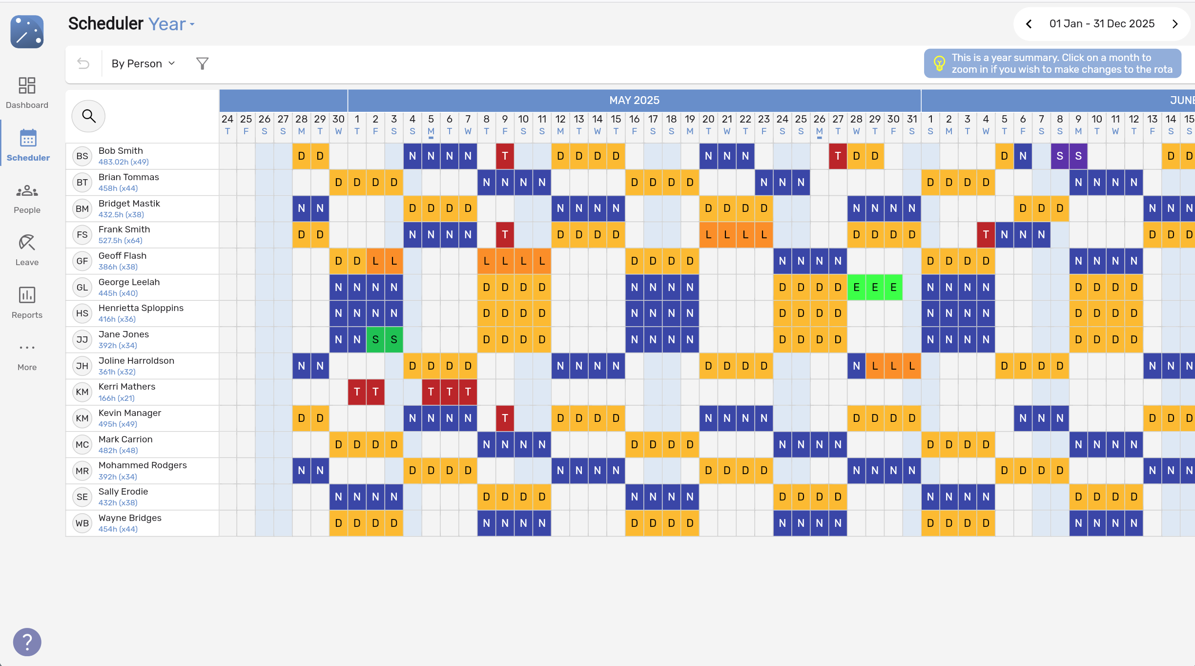 - Year View – See the whole year’s shifts. Includes work stats per user with detailed pop-out views.