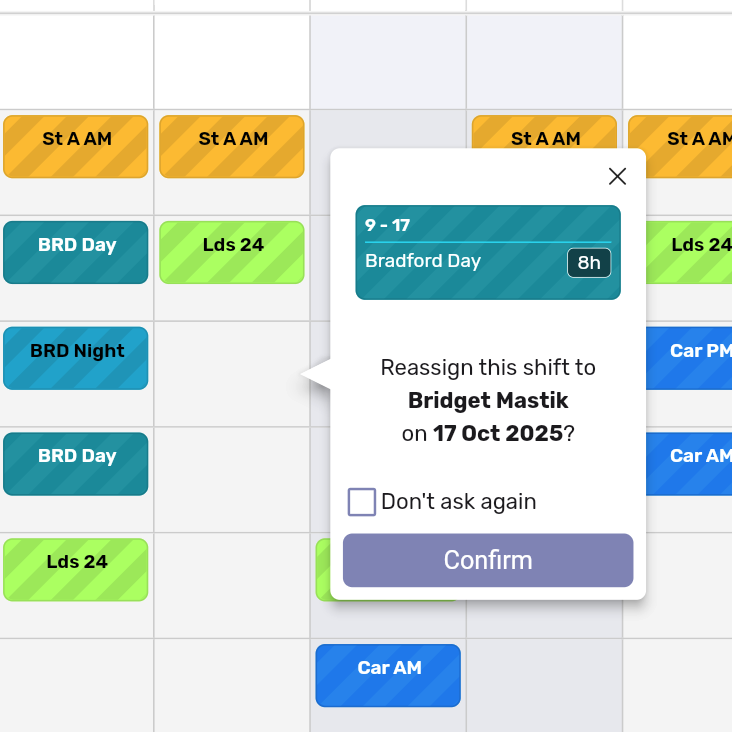 Move shifts between people or dates instantly. You can even configure it to confirm each change, or switch it off entirely if you prefer tighter control.