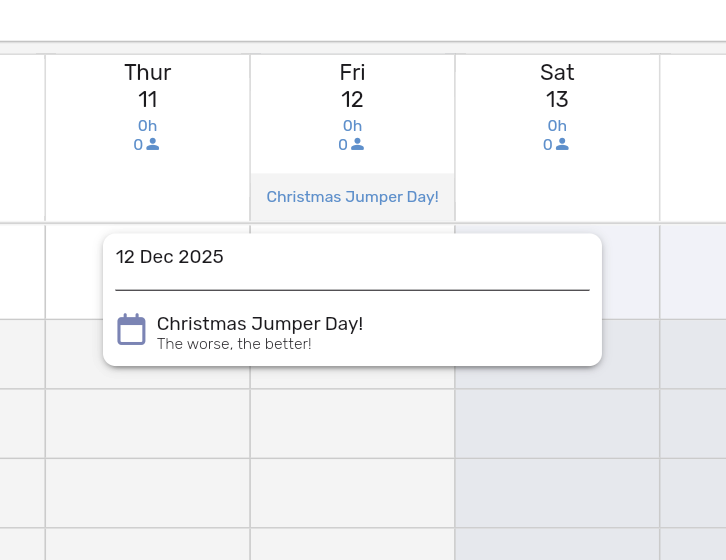 Add company-wide events that appear on the Scheduler (perfect for shutdowns or special days), and enforce annual leave allowances to prevent over-booking. Find this option in the More tab. You can add any number of events that will appear in the calendar for all users.